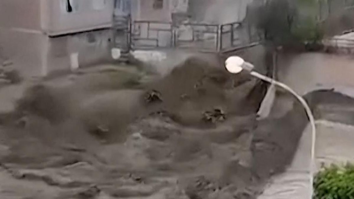 Rekaman video menunjukkan banjir bandang melanda kawasan pemukiman di Arequipa, Peru, pada Minggu (22/2).