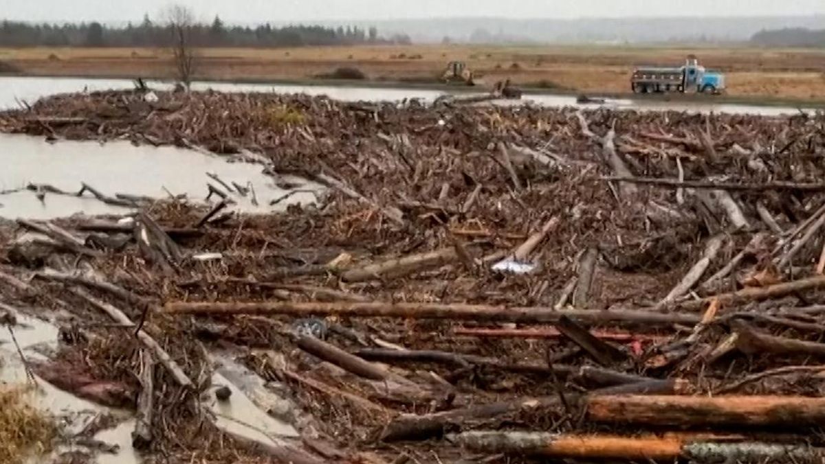 Kayu-kayu gelondongan kayu di bawah jembatan di Sungai Snohomish, Washington, AS, setelah banjir melanda kawasan tersebut.