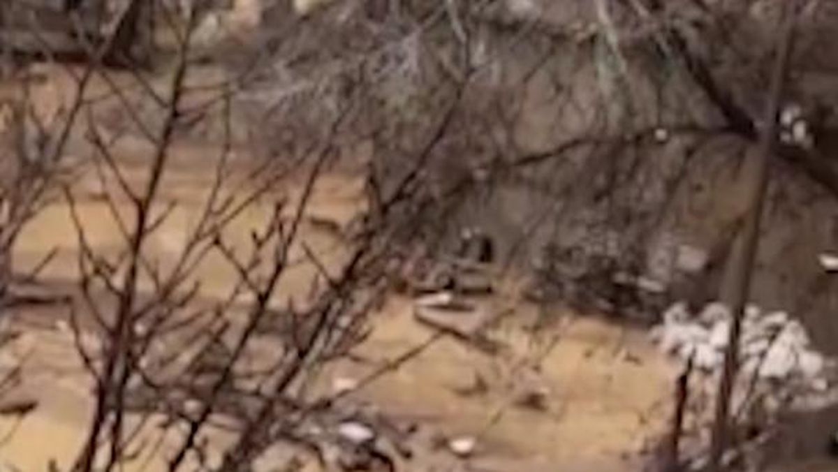 Rekaman video menunjukkan sebuah bangunan roboh dan tenggelam saat banjir besar di Makhachkala, Dagestan pada Minggu (5/4).