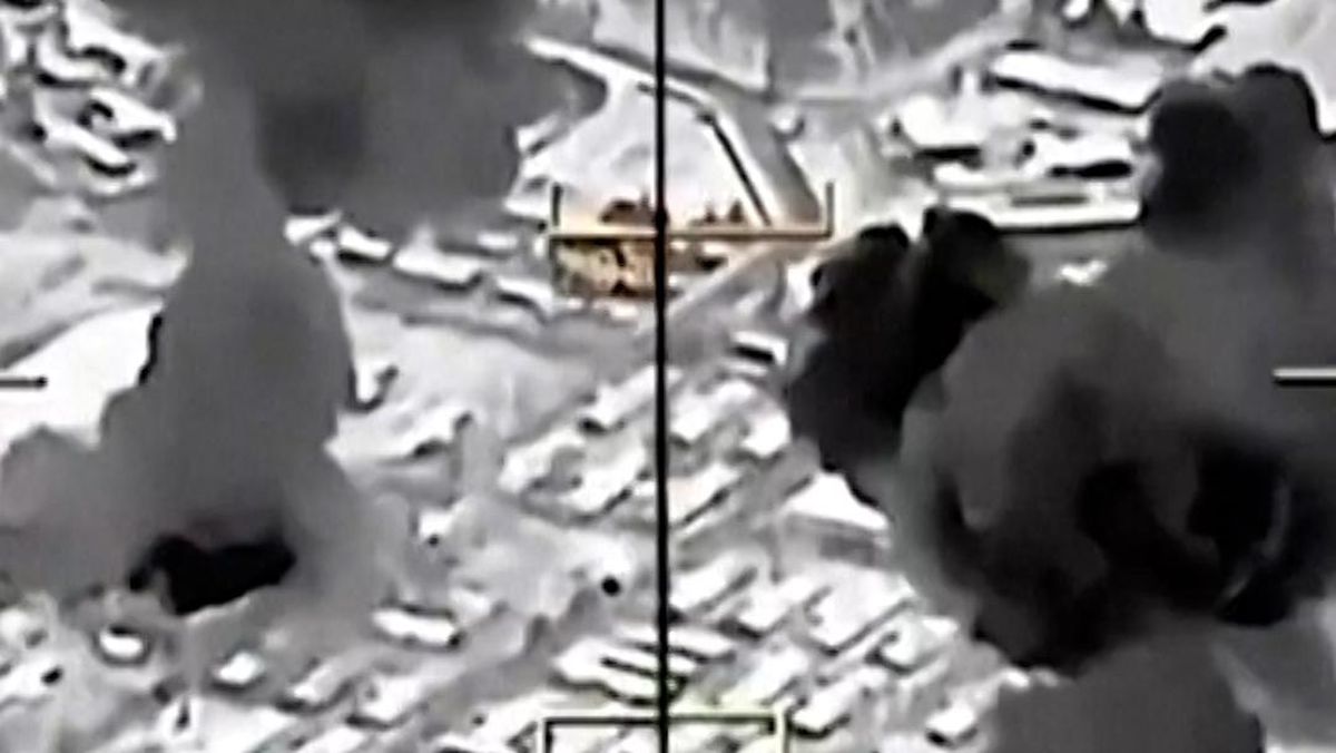 Dalam rekaman tersebut, terlihat dua serangan udara menghantam wilayah tersebut dan menimbulkan kepulan asap tebal.