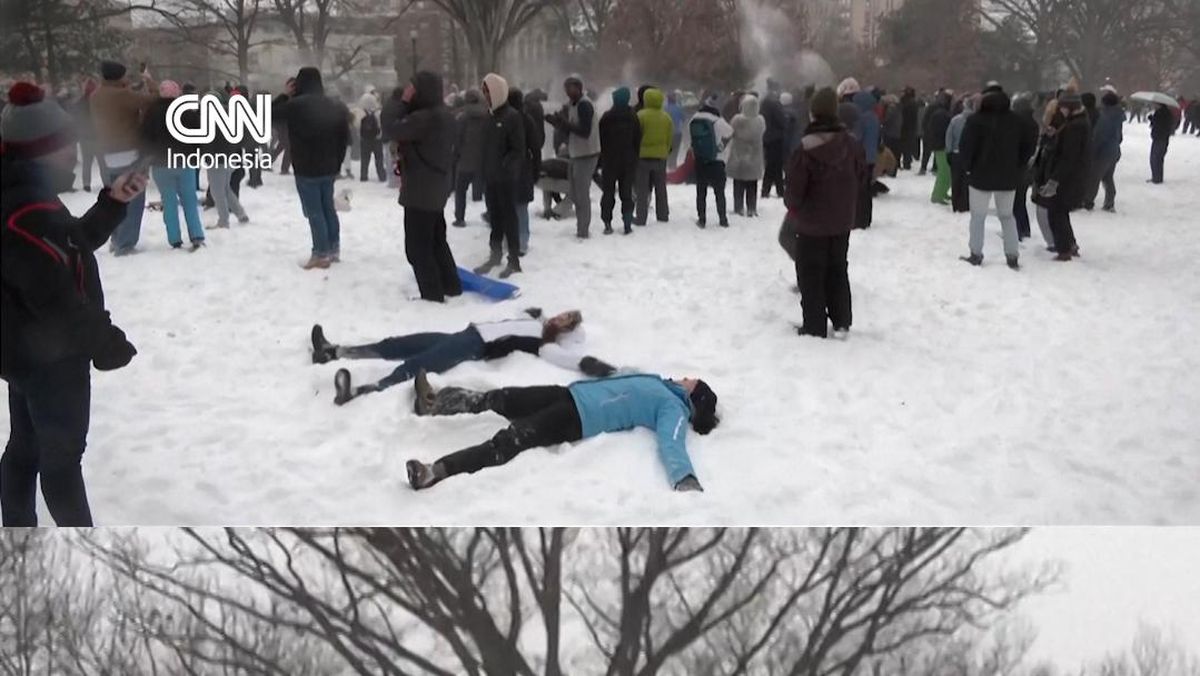Kegiatan ini menjadi momen keceriaan warga di tengah badai salju yang melanda kawasan tersebut.
