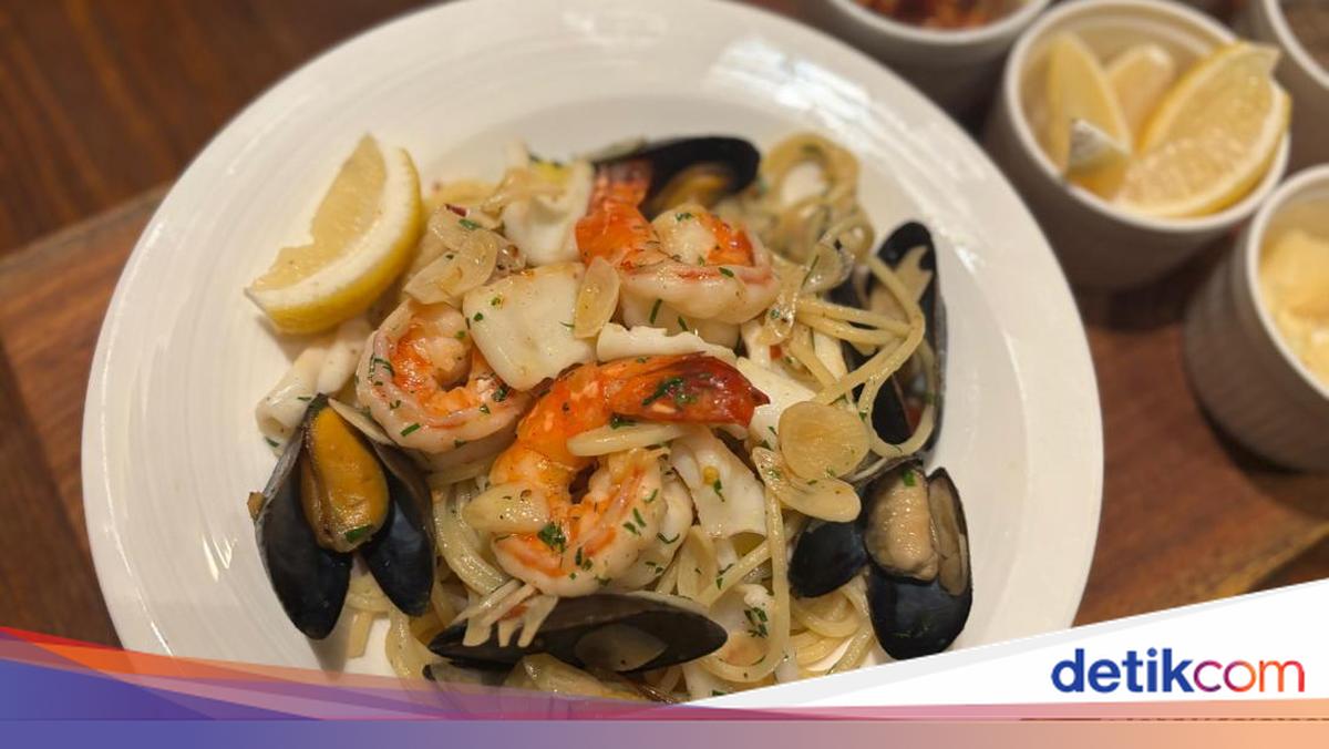 Sajian pasta ini disebut sebagai Spaghetti Aglio Olio Il Mare. Untuk isinya terdiri atas beberapa jenis seafood segar.