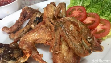 Sajikan ayam goreng dengan sambal dan lalapan.