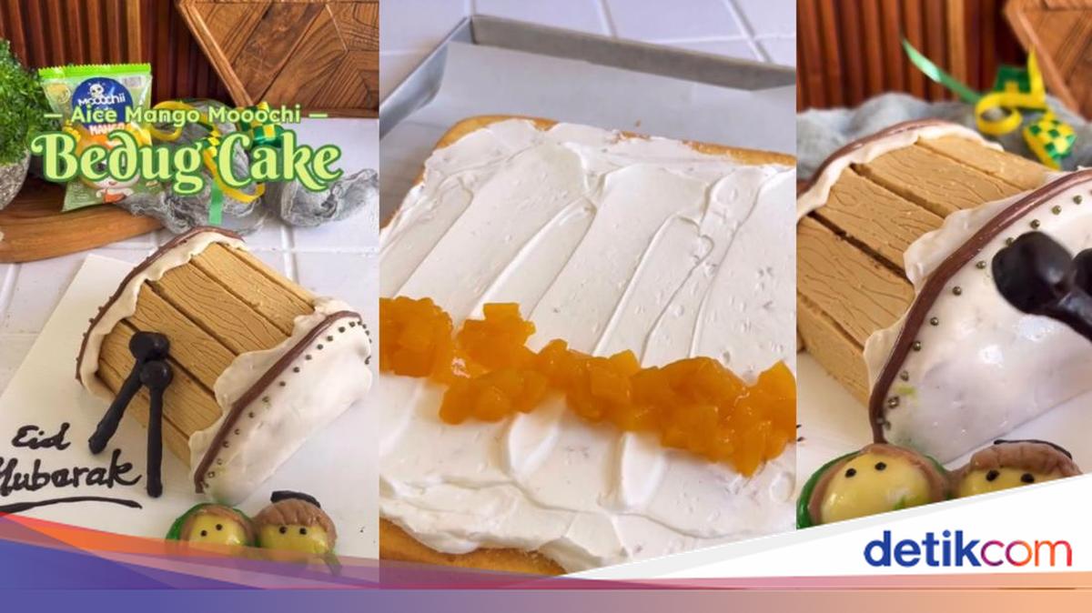 Es krim mochi rasa mangga dari AICE Mooochii itu dicampurkan untuk krim bolu gulung. Kemudian, ia menambahkan fondan untuk membentuknya menjadi bedug.